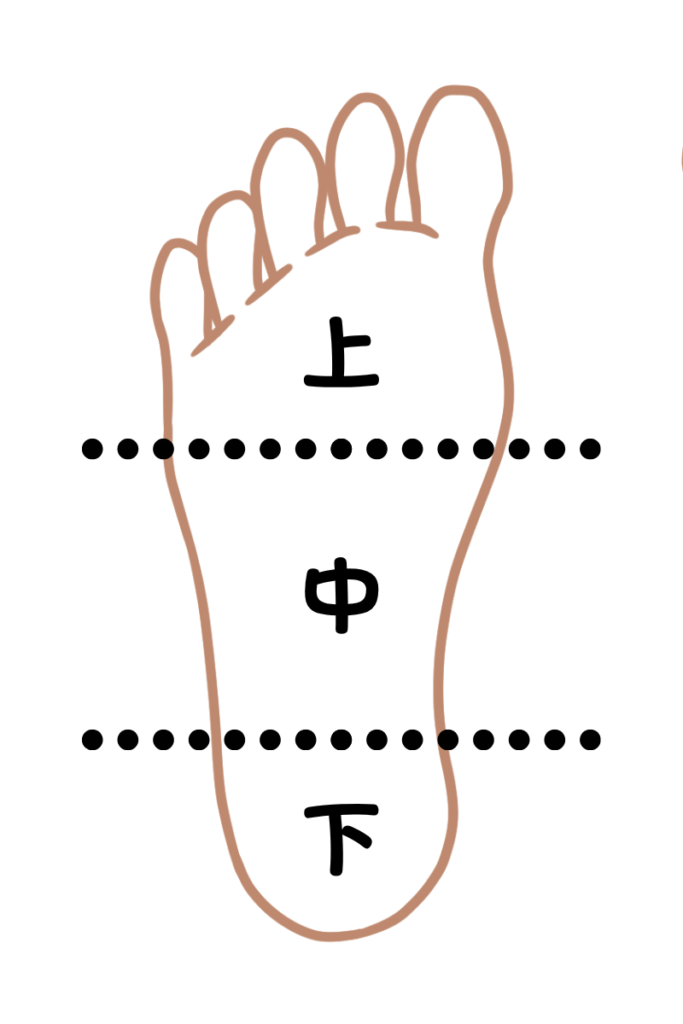 左足から始め、足裏を「上・中・下」の3つに分けて行います。